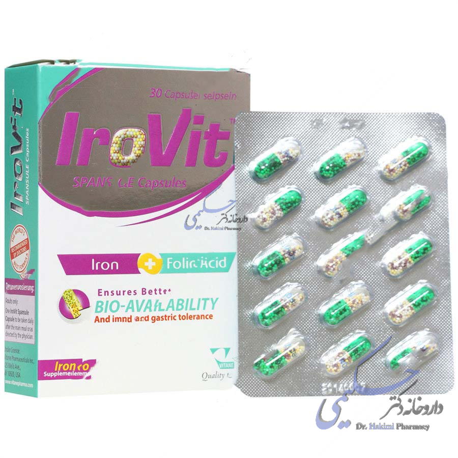 ایروویت حاوی آهن به فرم “سولفات” همراه با فولیک اسیدکپسول آیرویت دارای میزان نسبتا بالایی از آهن (47 میلی گرم آهن خالص)کمک به بهبود کم خونی فقر آهنآیروویت تامین کننده آهن مورد نیاز افراد مبتلا به آنمیکمک به بهبود علائم ناشی از کم خونی فقر آهنهر جعبه کپسول ایرویت مناسب استفاده به مدت 30 روز می باشد.