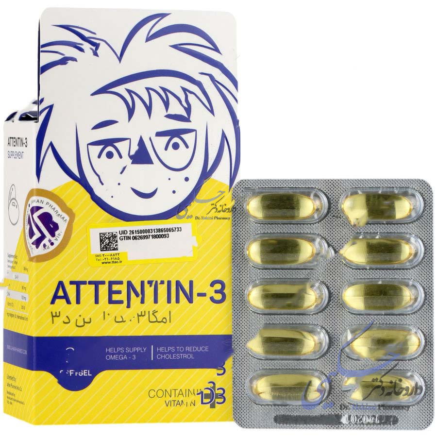 راهنمای عمومی:سافت ژل امگا3 مکمل تغذیه ای جهت کمک به سلامت سیستم قلب و عروقی، افزایش تمرکز و تقویت حافظه و تقویت سیستم ایمنی کودکان و حفظ سلامت چشم و عملکرد طبیعی سیستم بینایی می باشد.مصرف این محصول در کنار یک رژیم غذایی مناسب به افزایش قدرت سیستم ایمنی کودکان و نوجوانان، ترمیم زخم ها، تقویت قوه بینایی، چشایی، تقسیم طبیعی سلول ها رشد و تکامل در طول دوران کودکی و نوجوانی کمک خواهد کرد.وجود ویتامین D در این فرآورده به حفظ سلامتی استخوان ها و دندان های کودکان که به سرعت در حال رشد هستند کمک می کند.ترکیبات: اتنتین 3 به غیر تاثیرات مفید آن به عنوان روغن ماهی، حاوی اسیدهای چرب بسیار مفیدی از جمله ایکوزاپنتائنوییک اسید Eicosapentaenoic acid (EPA) و دوکوزاهگزائنوئیک اسید (Docosahexaenoic Acid (DHA می باشد. همچنین این محصول حاوی ویتامین D3 است.مکانیسم عمل: از جمله اثرات اتنتین-3، کاهش کلسترول در بیماری های قب و عروق، مفید در کبد چرب، سیستم بینایی، ترمیم زخم ها بوده و به طور کلی باعث ارتقاء سیگنالینگ های سلولی می شود. همچنین مطالعات زیادی نشان داده است که مصرف روزانه امگا3 باعث افزایش تمرکز، توجه و یادگیری می شود. مطالعات اخیر نشان داده اند که استفاده همزمان امگا3 و ویتامین D3، باعث ایجاد اثرات سینرژیکی قوی در جهت تاثیرگذاری بهتر امگا3 در سلامت بدن می شود. به علاوه ویتامین D3 در تقویت سیستم ایمنی، سیستم استخوان و دندان، رشد و نمو اطفال، تنظیم قند خون و جلوگیری از آسم کودکان مفید می باشد.